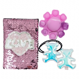 Gift box με ροζ σημειωματάριο Love, λαστιχάκι και κλιπ μαλλιών teddy bear και ροζ pop it