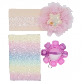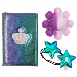 Gift box με ιριδίζον σημειωματάριο Crown, λαστιχάκι και κλιπ μαλλιών αστεράκια και ροζ pop it