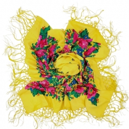 Μεγάλη τετράγωνη εκρού Ιταλική μαντήλα με πράσινες, μπλε, κίτρινες και φούξια άκρες από σύμμεικτο βαμβάκι