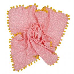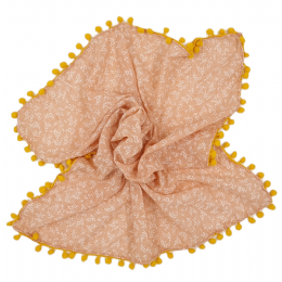 Σομόν τετράγωνο μαντήλι με λευκά λουλουδάκια και κίτρινα pom pom απο σύμμεικτο βαμβάκι
