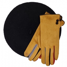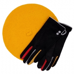 Μουσταρδί μάλλινος μπερές και μαύρα ελαστικά γάντια από μαλακό ύφασμα με χρωματιστές λεπτομέρειες και λούτρινη επένδυση
