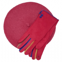 Rose pink μάλλινος μπερές και ελαστικά γάντια από μαλακό ύφασμα με χρωματιστές λεπτομέρειες και λούτρινη επένδυση
