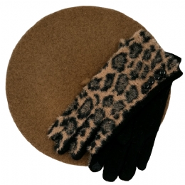 Σετ από mocca μάλλινο μπερέ και aninal print χνουδωτά γάντια