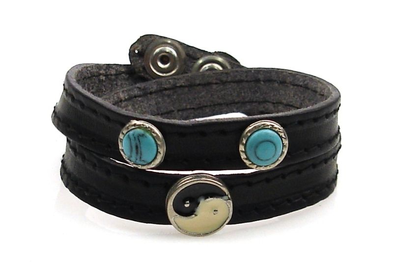 DOUBLE BLACK LEATHER BRACELET WITH SILVER YIN YANG