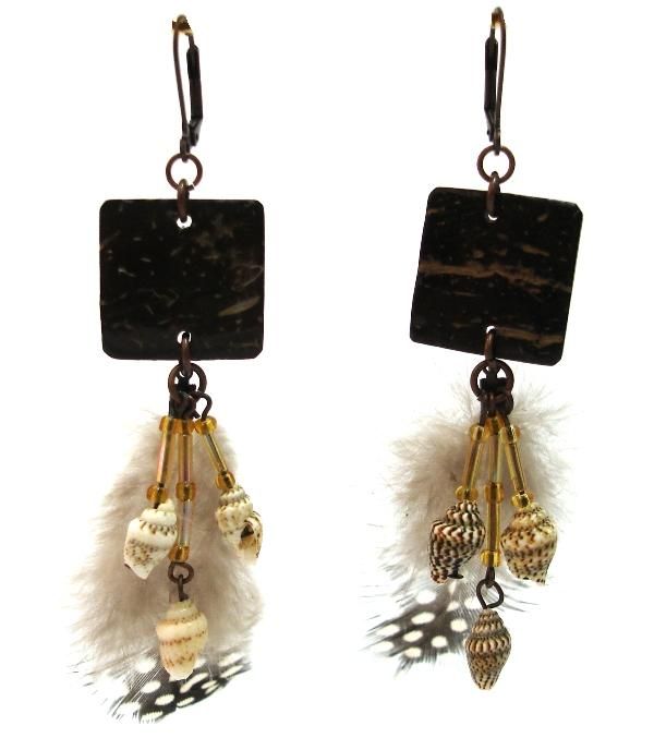 Σκουλαρίκια με τετράγωνα μπαμπού, κοχύλια και φτερά