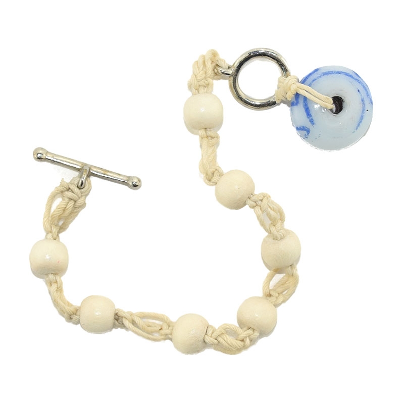 Εκρού βραχιόλι με ξύλινες χάντρες και στρόγγυλο γυάλινο γούρι