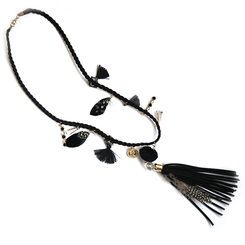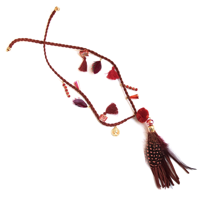 Boho κολιέ με φούντες και πουά φτερά