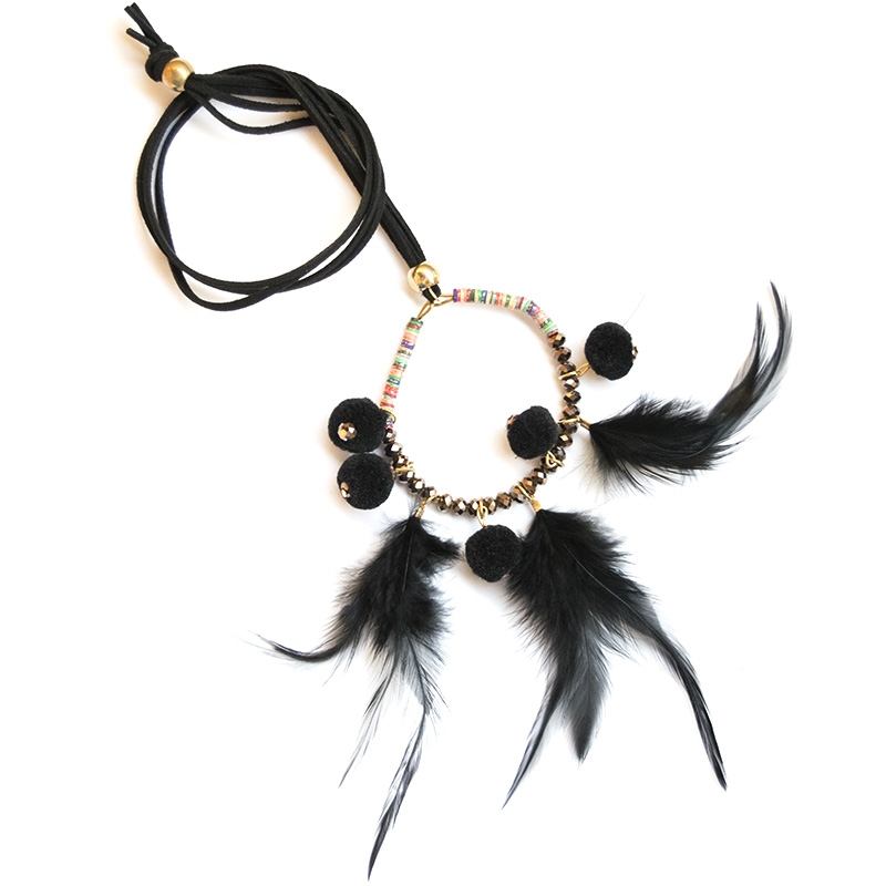 Μακρύ μαύρο κολιέ κρίκος με φουντάκια και φτερά