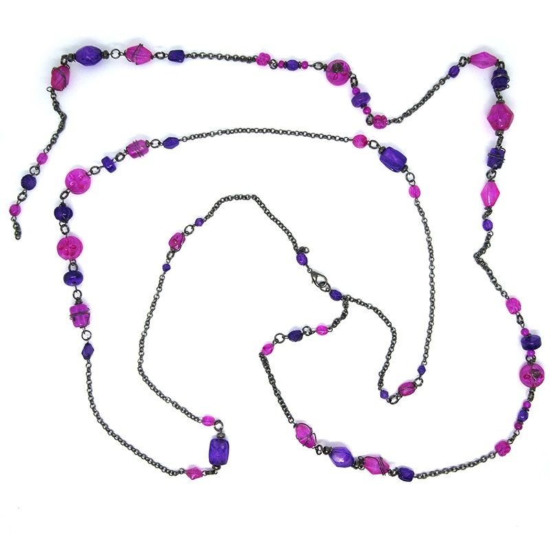 Γκρι κολιέ - ζώνη αλυσίδα με μοβ και φουξ χάντρες