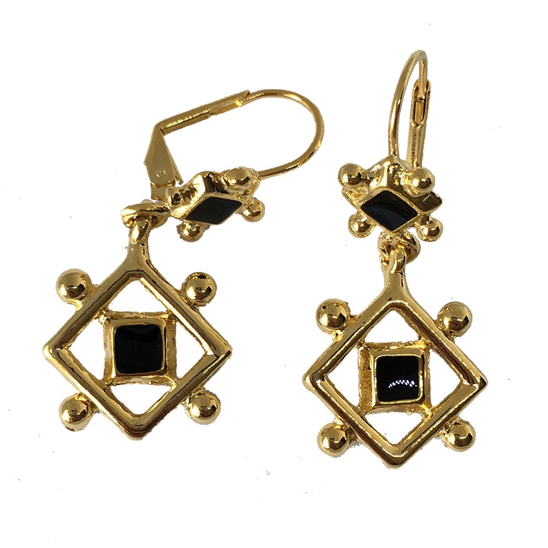 Χρυσά λεπτά σκουλαρίκια με κρεμαστούς ρόμβους και σχέδιο από μαύρο σμάλτο
