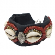 Μαύρο βραχιόλι από ύφασμα canvas και κόκκινες χάντρες με κοχύλια