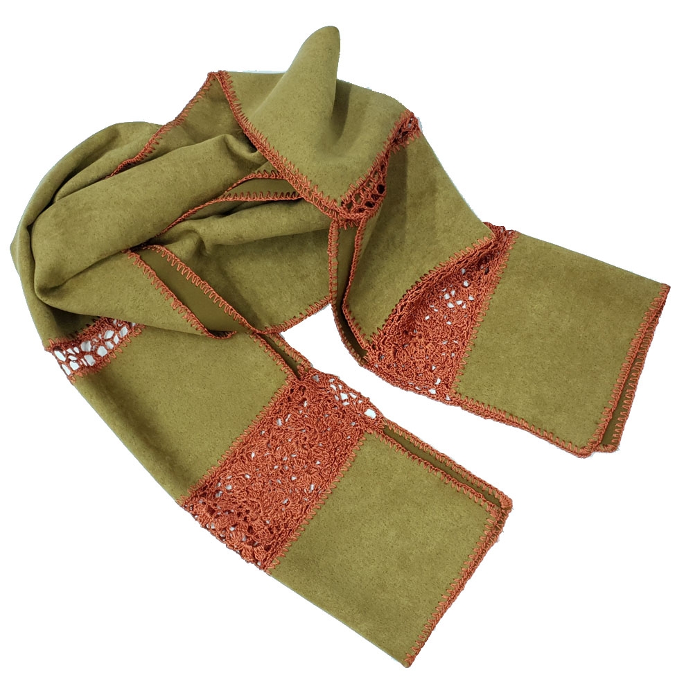 Στενό κάμελ φουλάρι alcantara με ταμπά crochet λουλούδια και εξώραφα