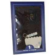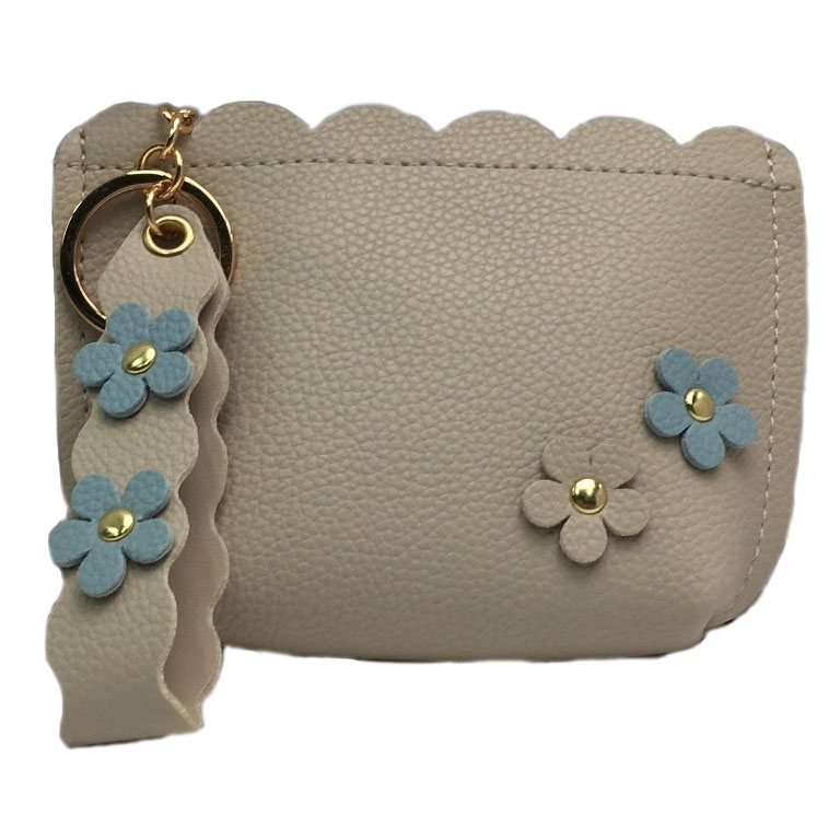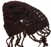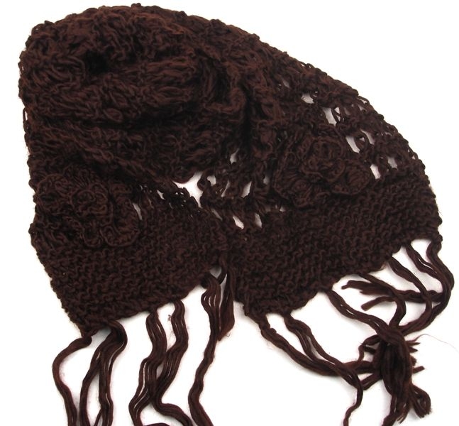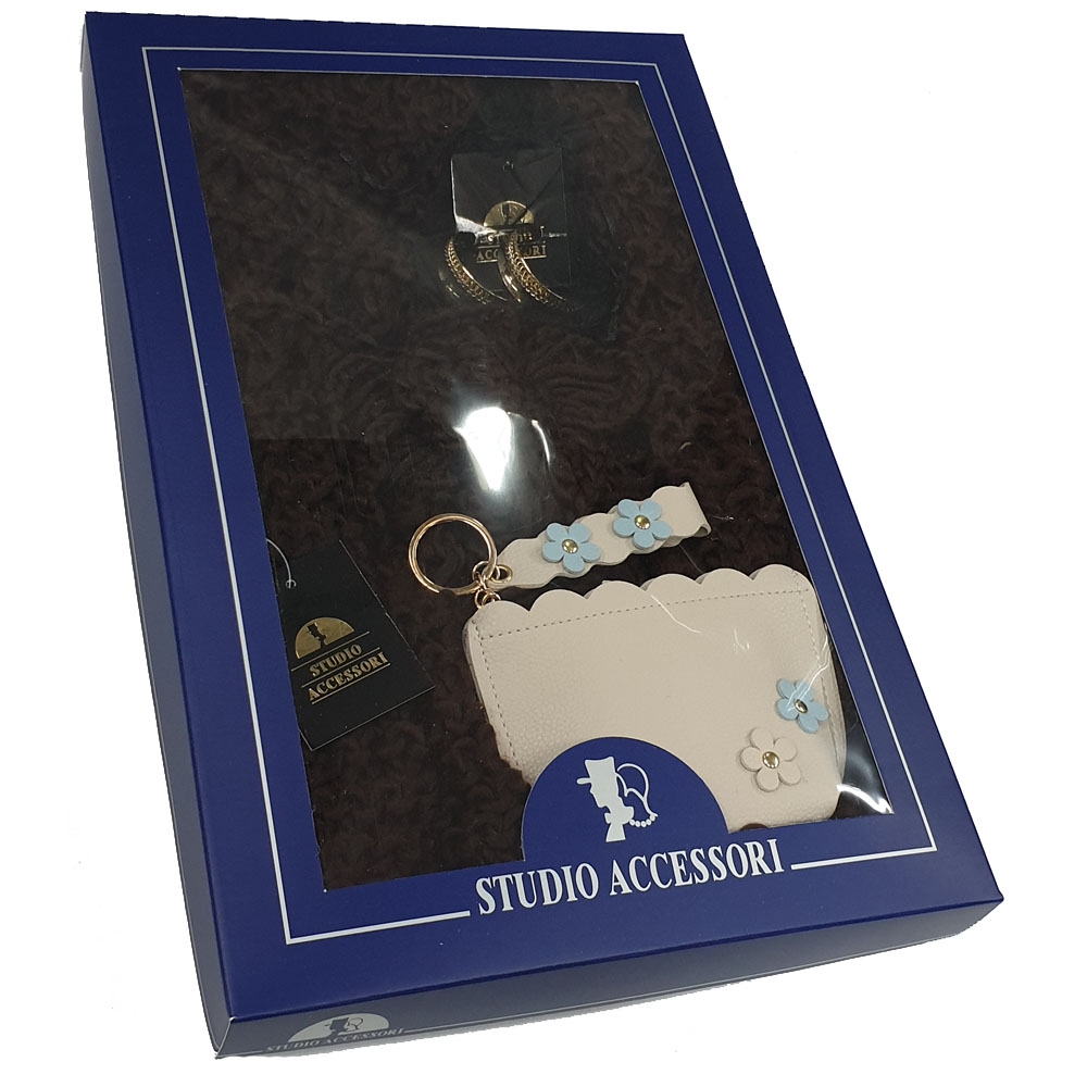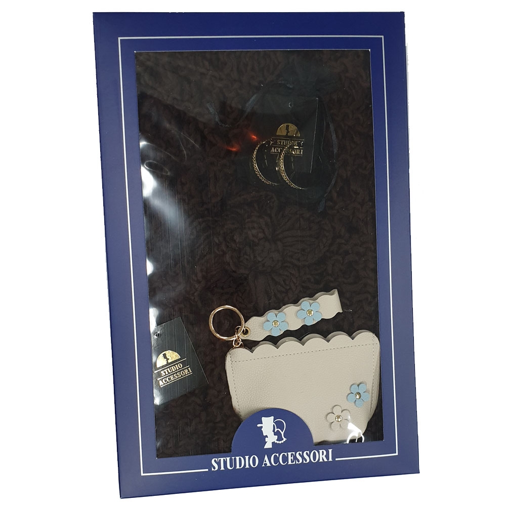 Γυναικείο και εφηβικό σετ δώρου με καφέ πλεκτό κασκόλ, μπεζ μπρελόκ πορτοφολάκι και χρυσά σκουλαρίκια κρίκοι με αλυσίδα