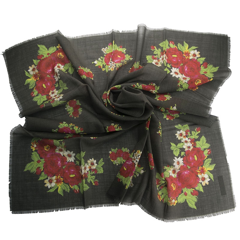 Τετράγωνη γκρι-καφέ Ιταλική μάλλινη μαντήλα με μπουκέτα από κόκκινα τριαντάφυλλα