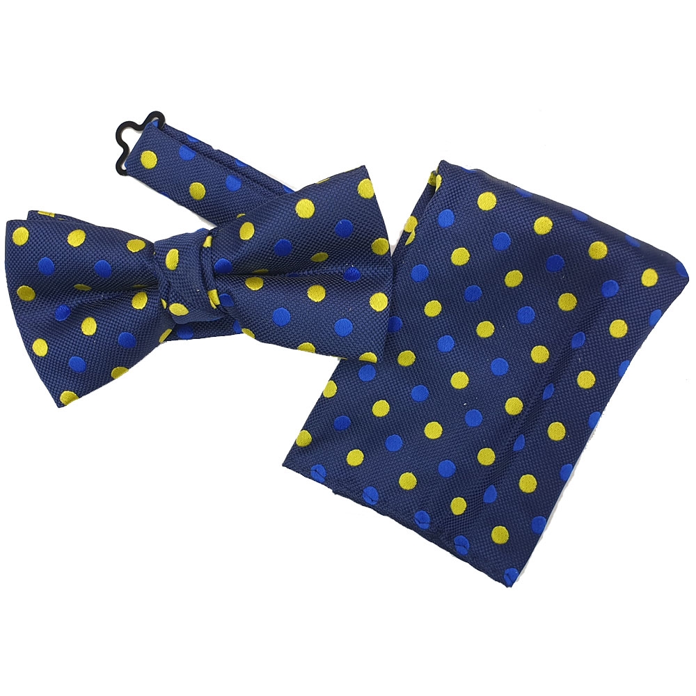 Μπλε παπιγιόν και μαντηλάκι τσέπης με κίτρινα και μπλε ρουαγιάλ πουά