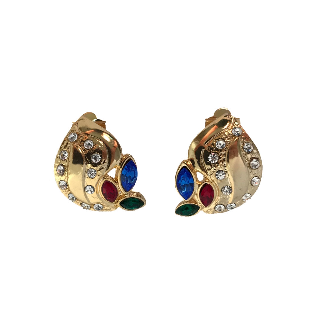 Μικρά χρυσά σκουλαρίκια κλιπ με χρωματιστές πέτρες και λευκά στρας