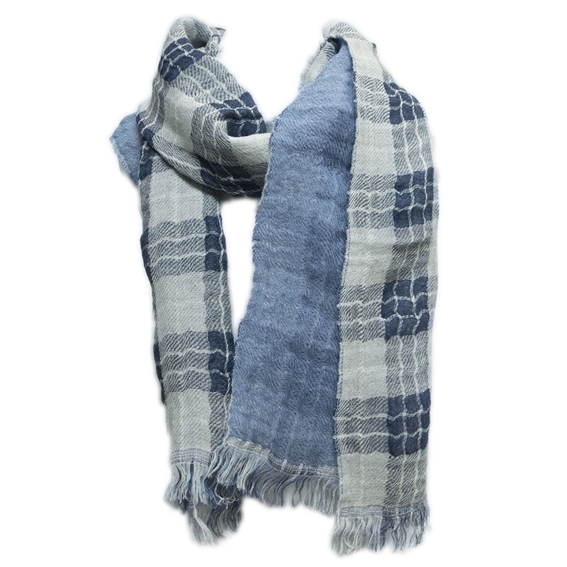 Ιταλικό μάλλινο unisex κασκόλ διπλής όψης με καρό και μονόχρωμη jeans πλευρά