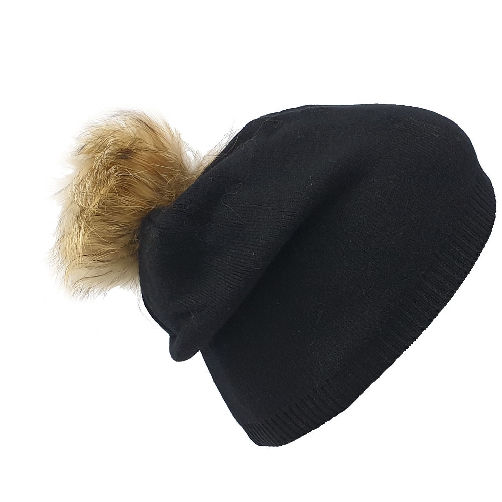 Μονόχρωμος μαύρος unisex μακρύς σκούφος με μαλλί και μεγάλη φούντα