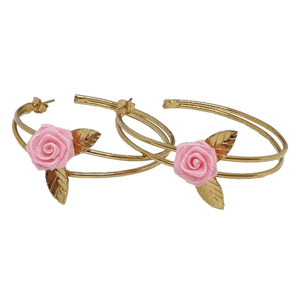 Διπλοί χρυσοί κρίκοι με ροζ υφασμάτινο τριανταφυλλάκι