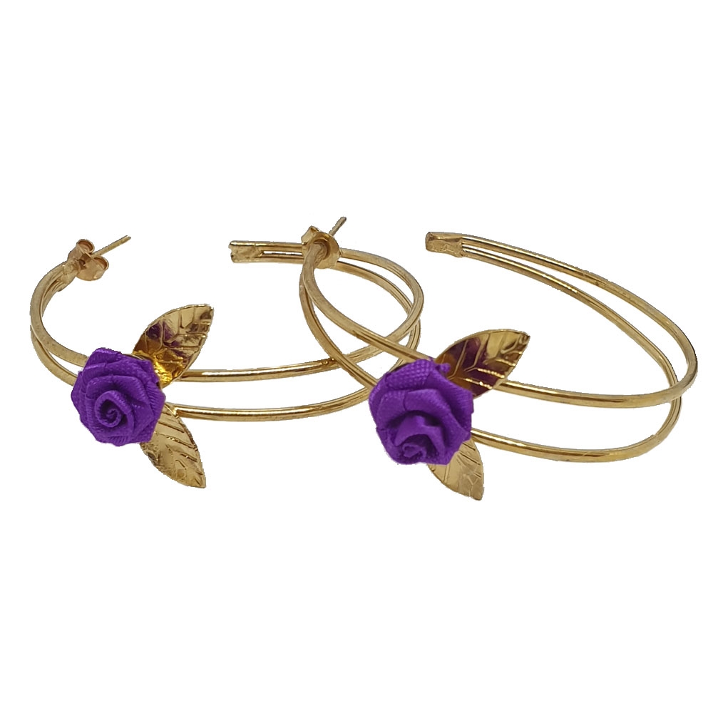 Διπλοί χρυσοί κρίκοι με μωβ υφασμάτινο τριανταφυλλάκι