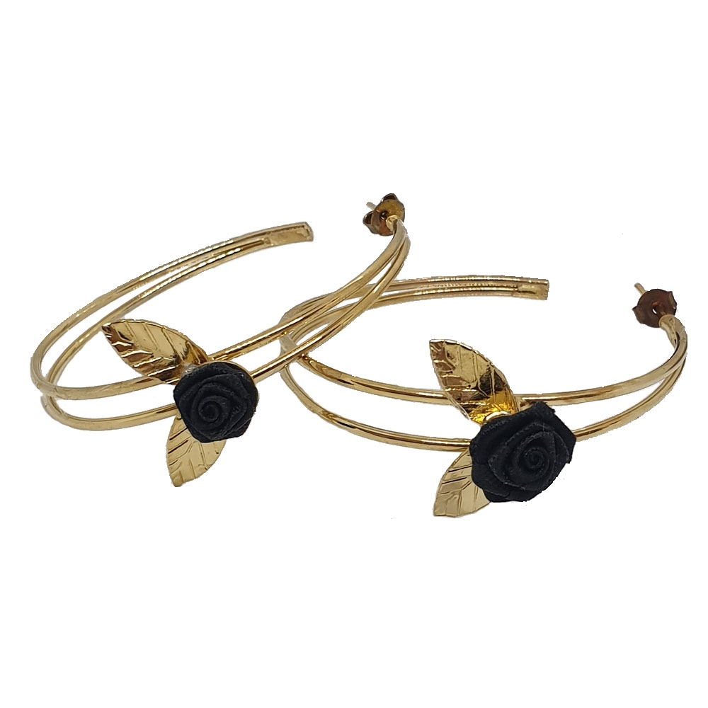 Διπλοί χρυσοί κρίκοι με μαύρο υφασμάτινο τριανταφυλλάκι