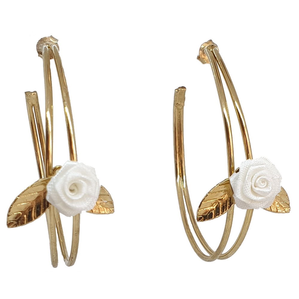 Διπλοί χρυσοί κρίκοι με λευκό υφασμάτινο τριανταφυλλάκι