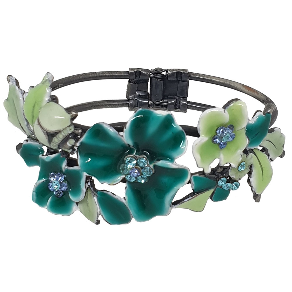 Βραχιόλι Blooming flowers με βεραμάν και πετρόλ λουλούδια από σμάλτο και στρας
