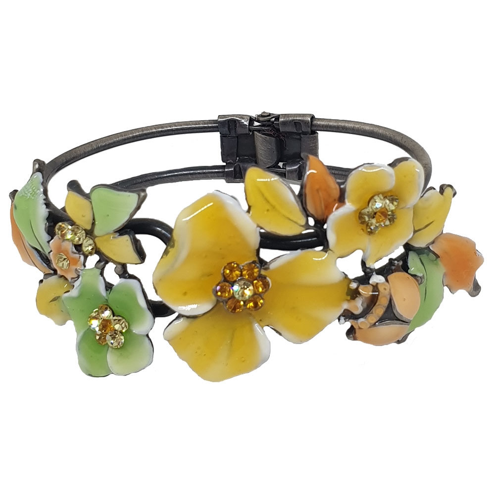 Βραχιόλι Blooming flowers με κίτρινα, πράσινα και σομόν λουλούδια από σμάλτο και στρας