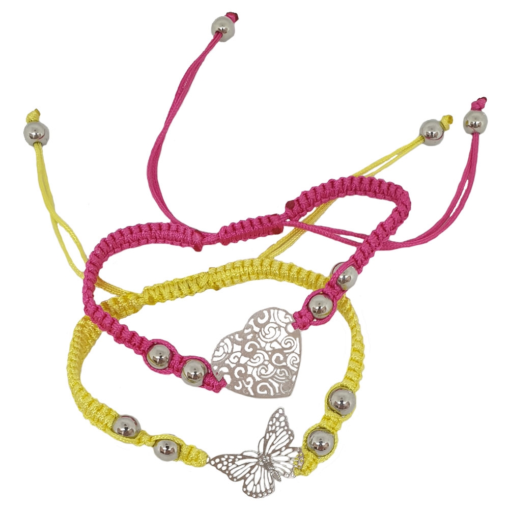 Φουξ και κίτρινο σετ βραχιόλια μακραμέ με σκαλιστή καρδιά και πεταλούδα