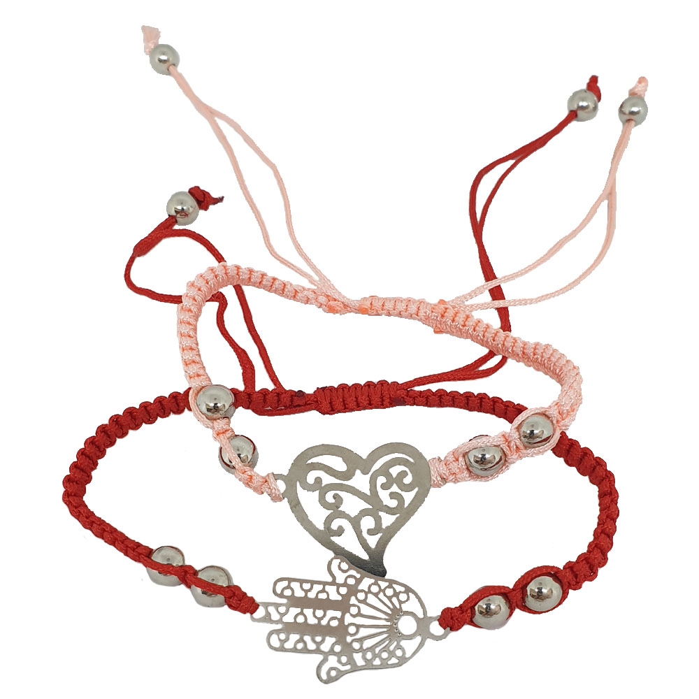 Ροζ και κόκκινο σετ βραχιόλια μακραμέ με σκαλιστή καρδιά και το Χέρι της Φατιμά