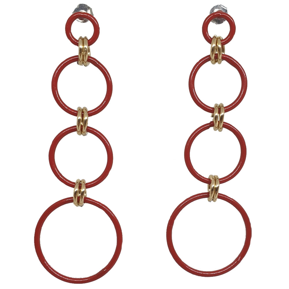 Κόκκινα μακριά μεταλλικά σκουλαρίκια με ασύμμετρους κρίκους και χρυσές λεπτομέρειες