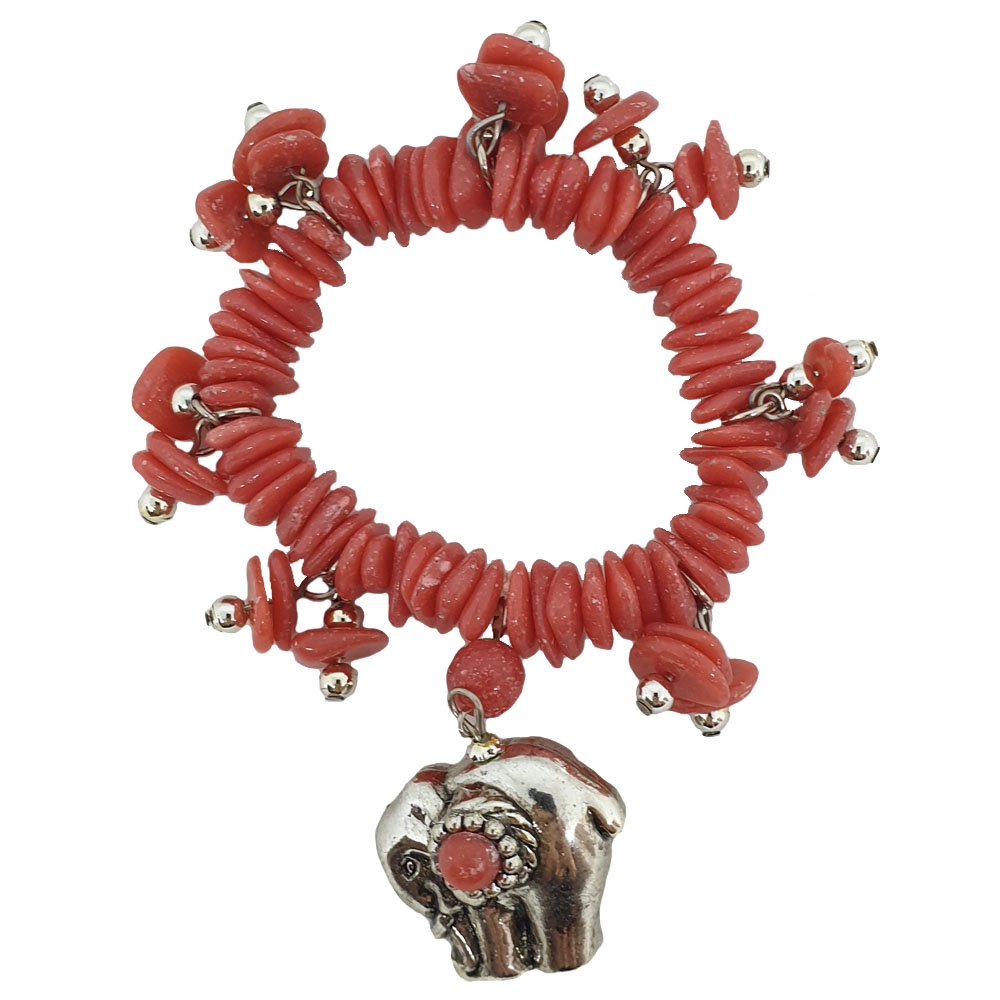 Ελαστικό βραχιόλι με κοραλί lucite πέτρες και ασημένιο charm με ελέφαντα
