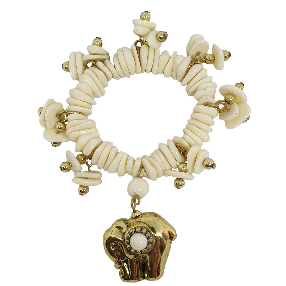 Ελαστικό βραχιόλι με εκρού lucite πέτρες και χρυσό charm με ελέφαντα
