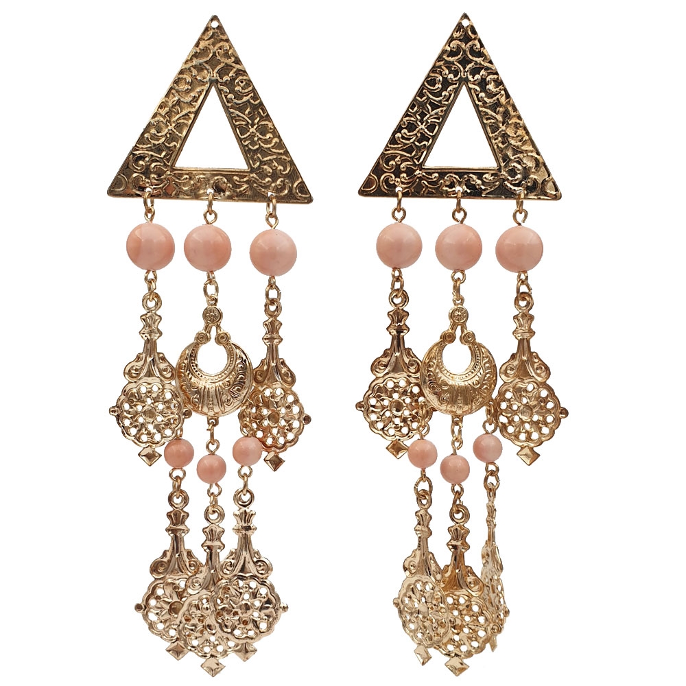 Μακριά χρυσά σφυρήλατα σκουλαρίκια με σομόν πέτρες και χρυσά charms