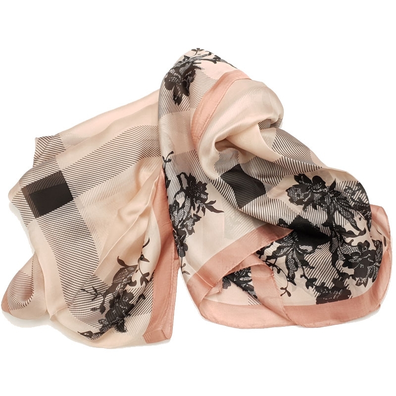 Ροζ φαρδύ καρό φουλάρι - εσάρπα με floral lace τύπωμα από σύμμεικτο μετάξι