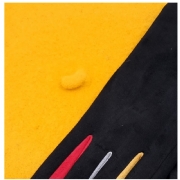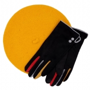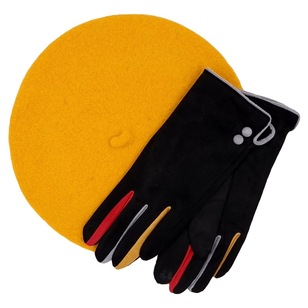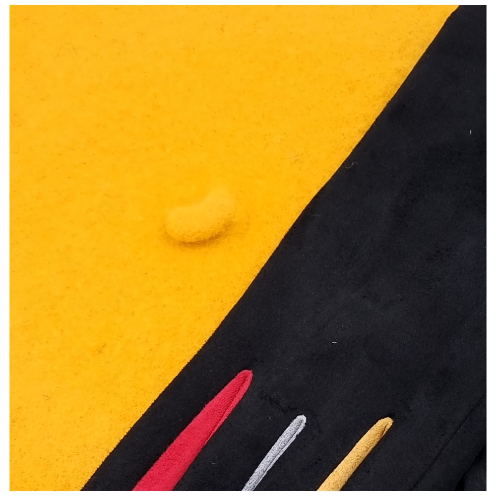 Μουσταρδί μάλλινος μπερές και μαύρα ελαστικά γάντια από μαλακό ύφασμα με χρωματιστές λεπτομέρειες και λούτρινη επένδυση