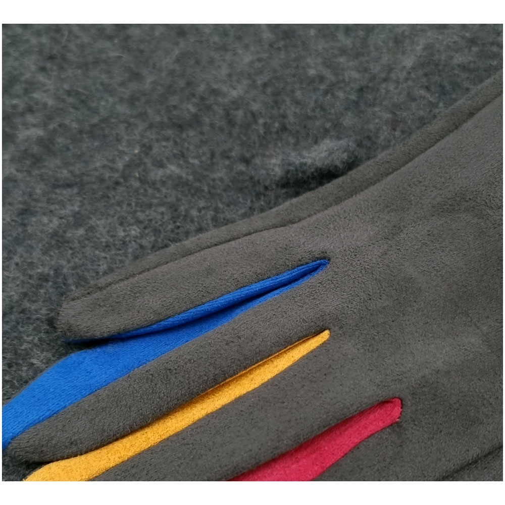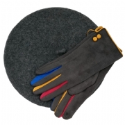Ανθρακί μάλλινος μπερές και ελαστικά γάντια από μαλακό ύφασμα με χρωματιστές λεπτομέρειες και λούτρινη επένδυση