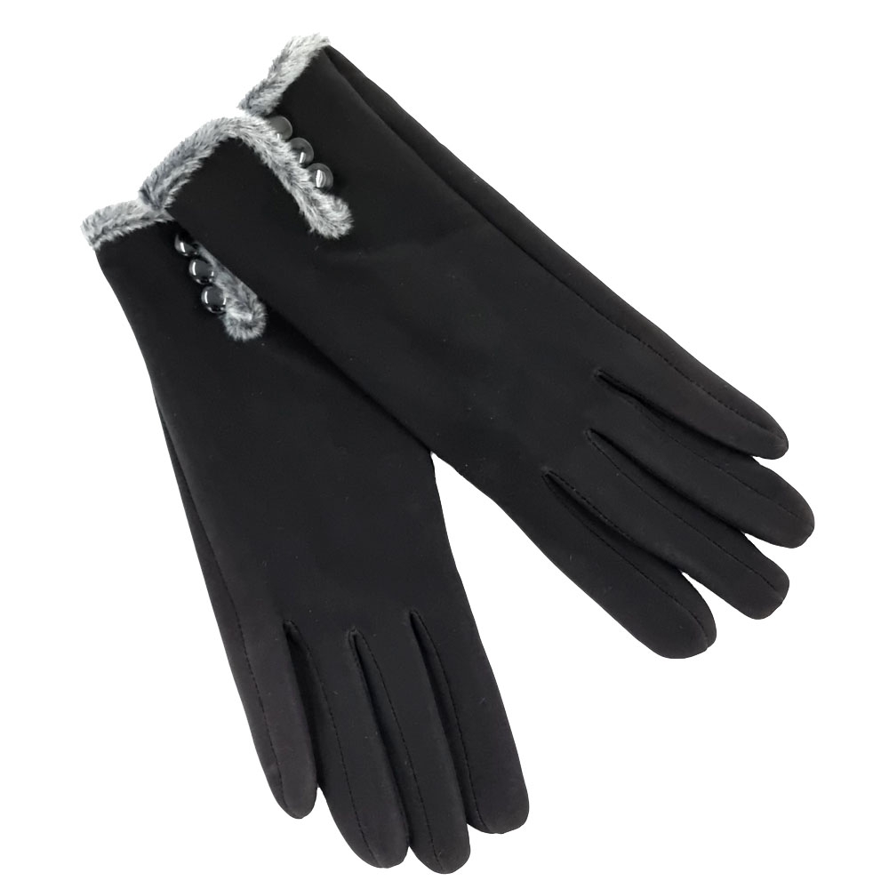 Μαύρα ελαστικά γάντια με γκρι χνουδωτή μανσέτα με κουμπάκια και λούτρινη επένδυση