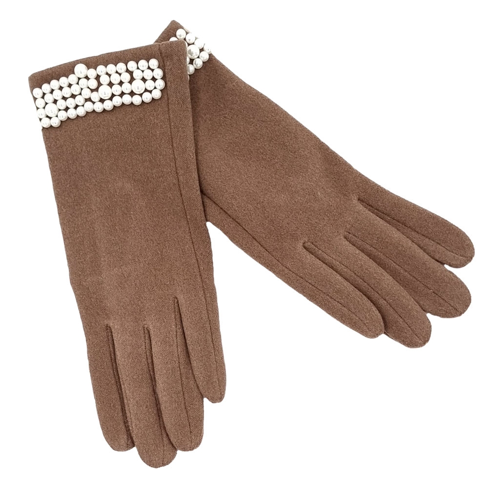 Mocca ελαστικά υφασμάτινα γάντια με πέρλες και λούτρινη επένδυση