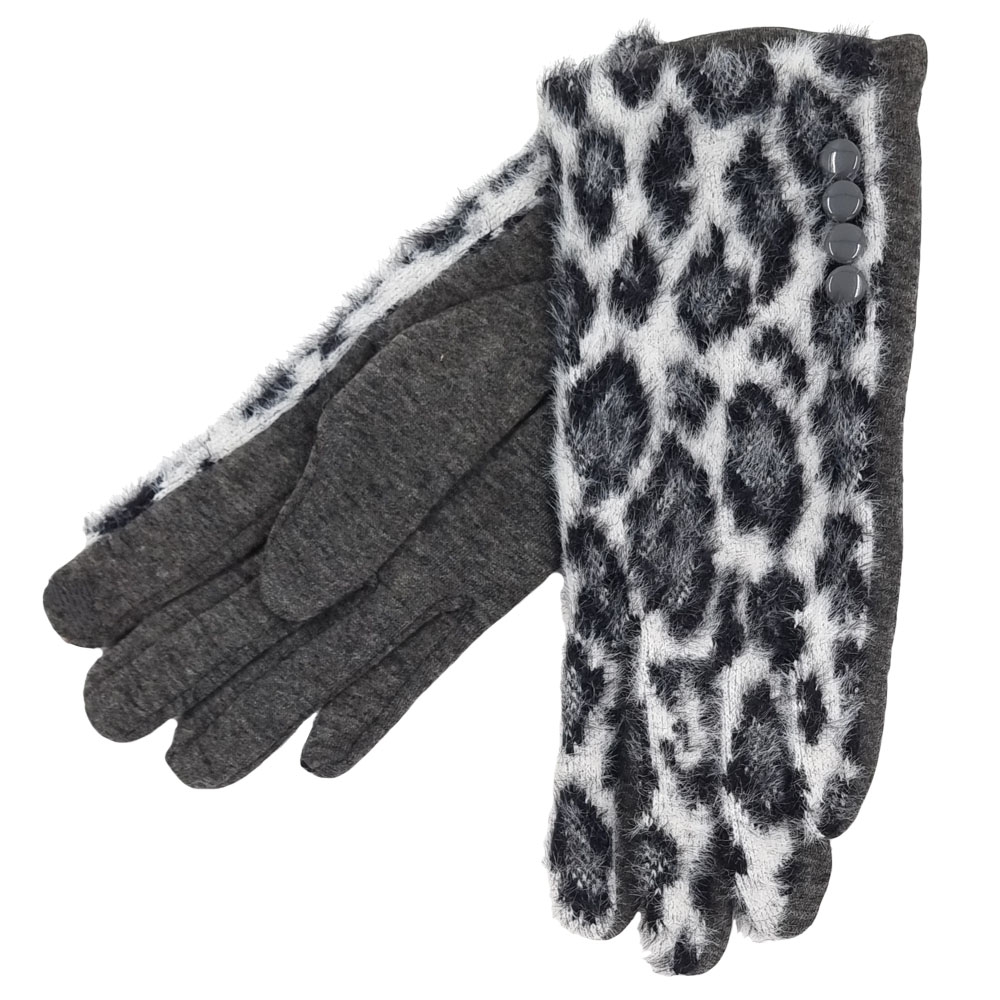 Γκρι ελαστικά γάντια με χνουδωτό animal print και λούτρινη επένδυση
