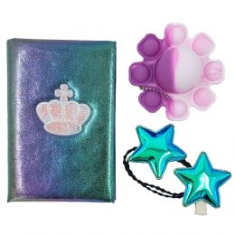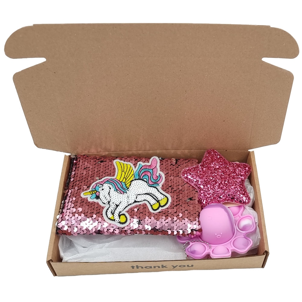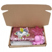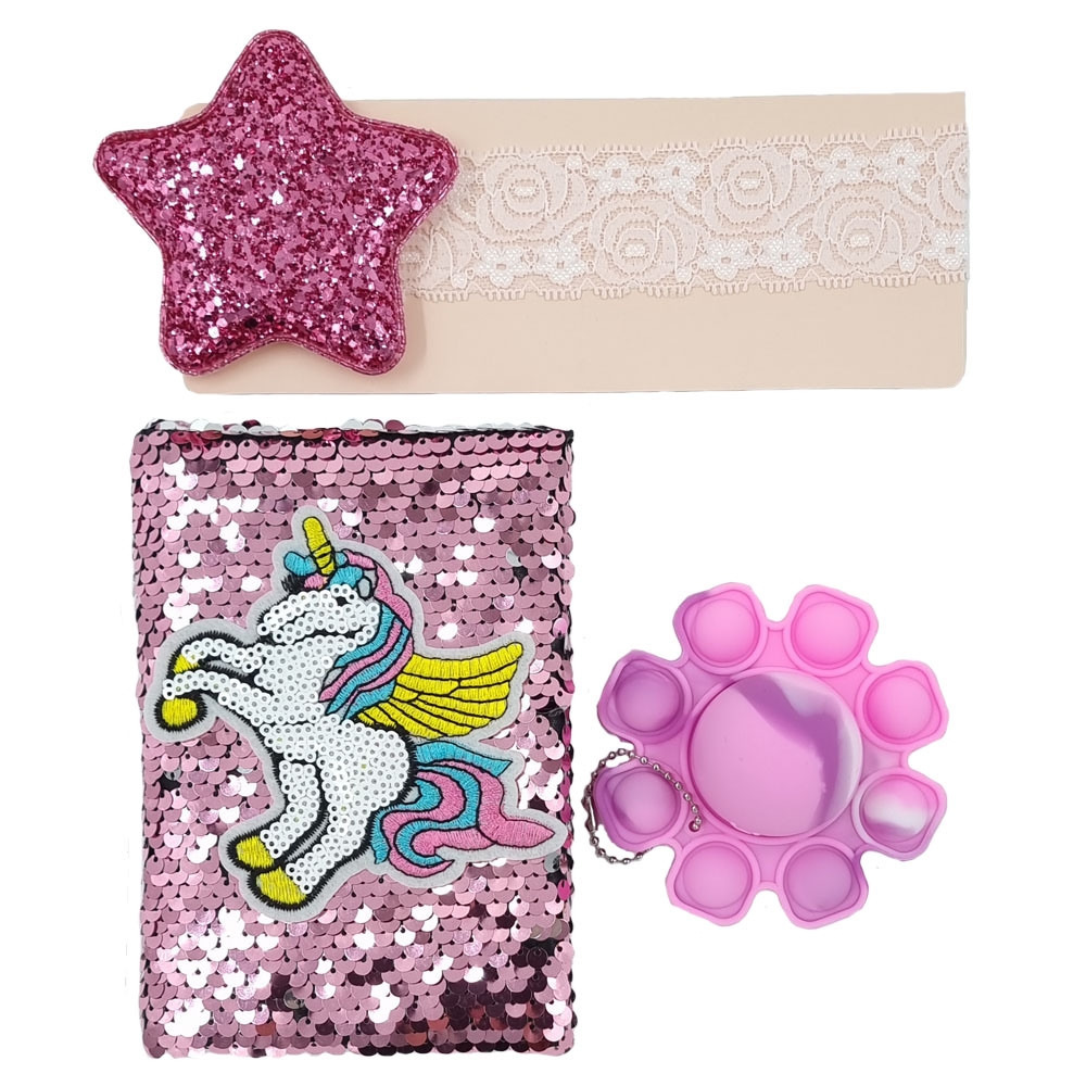 Gift box με σημειωματάριο Unicorn, κορδέλα μαλλιών με sparkling αστέρι και ροζ pop it