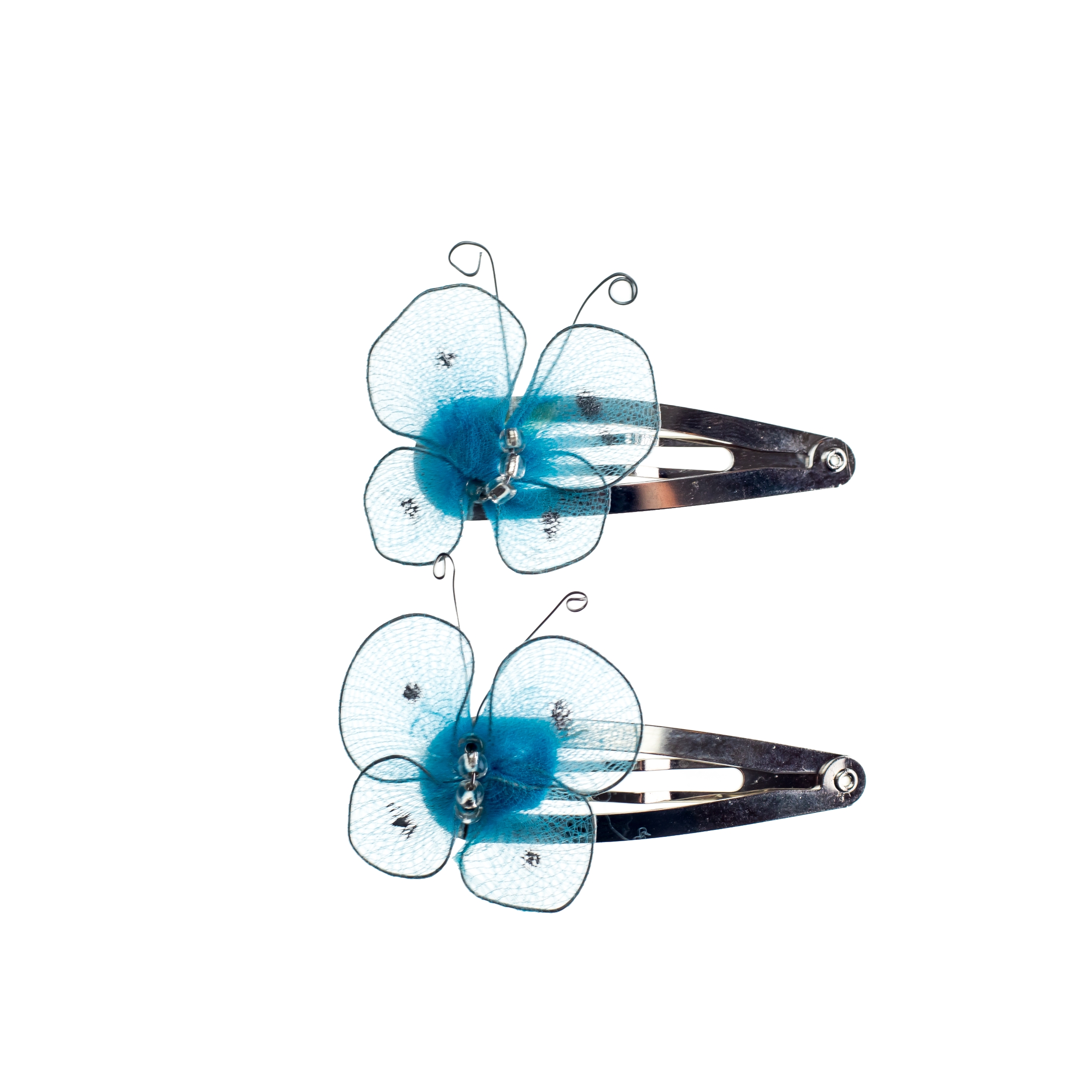Σετ από δύο ασημί κλιπ μαλλιών με γαλάζιες υφασμάτινες πεταλούδες