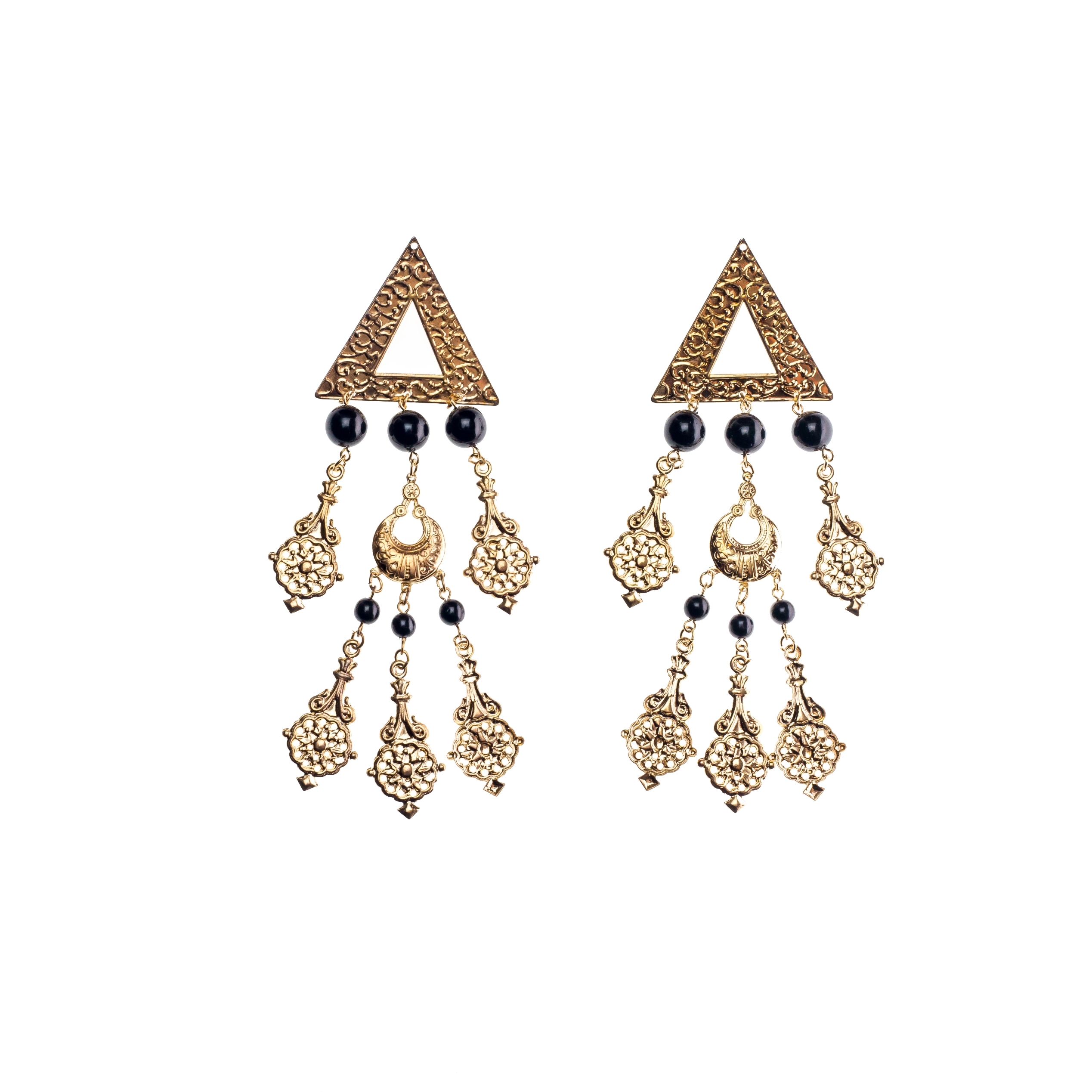 Μακριά χρυσά σφυρήλατα σκουλαρίκια με μαύρες πέτρες και χρυσά charms