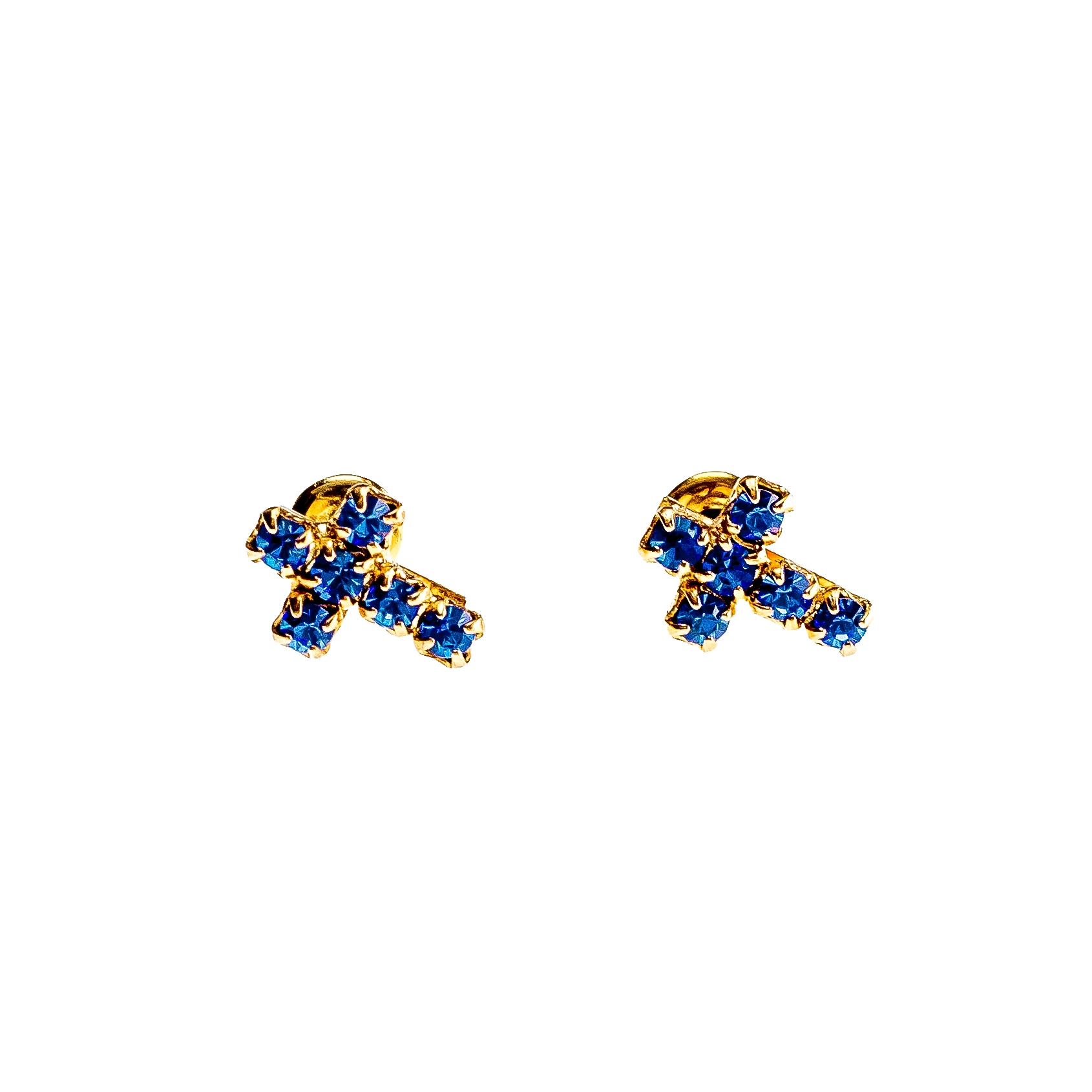 Χρυσά σκουλαρίκια σταυρουδάκια με royal μπλε στρας