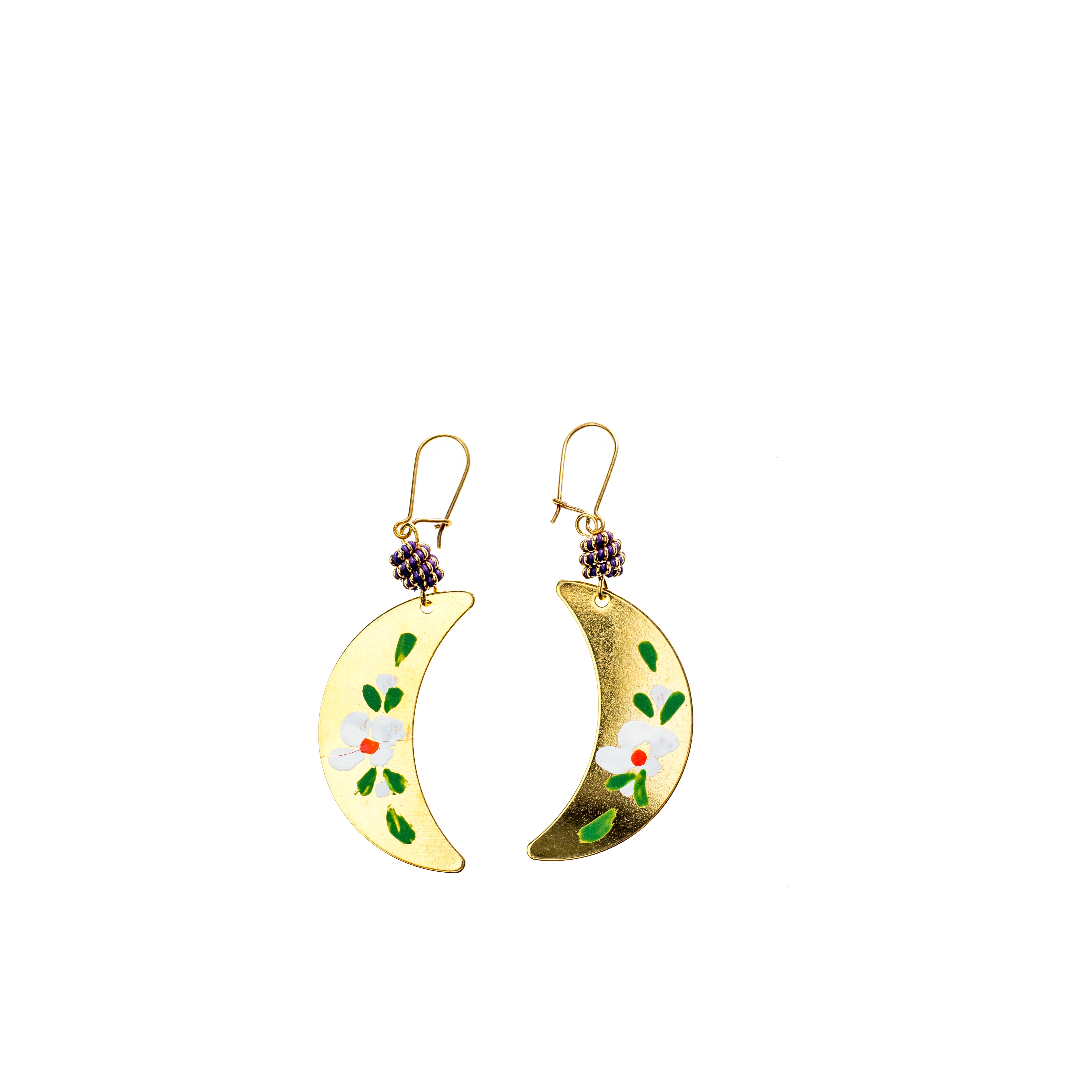 Χρυσά κρεμαστά σκουλαρίκια φεγγάρια με ζωγραφισμένα λευκά λουλούδια