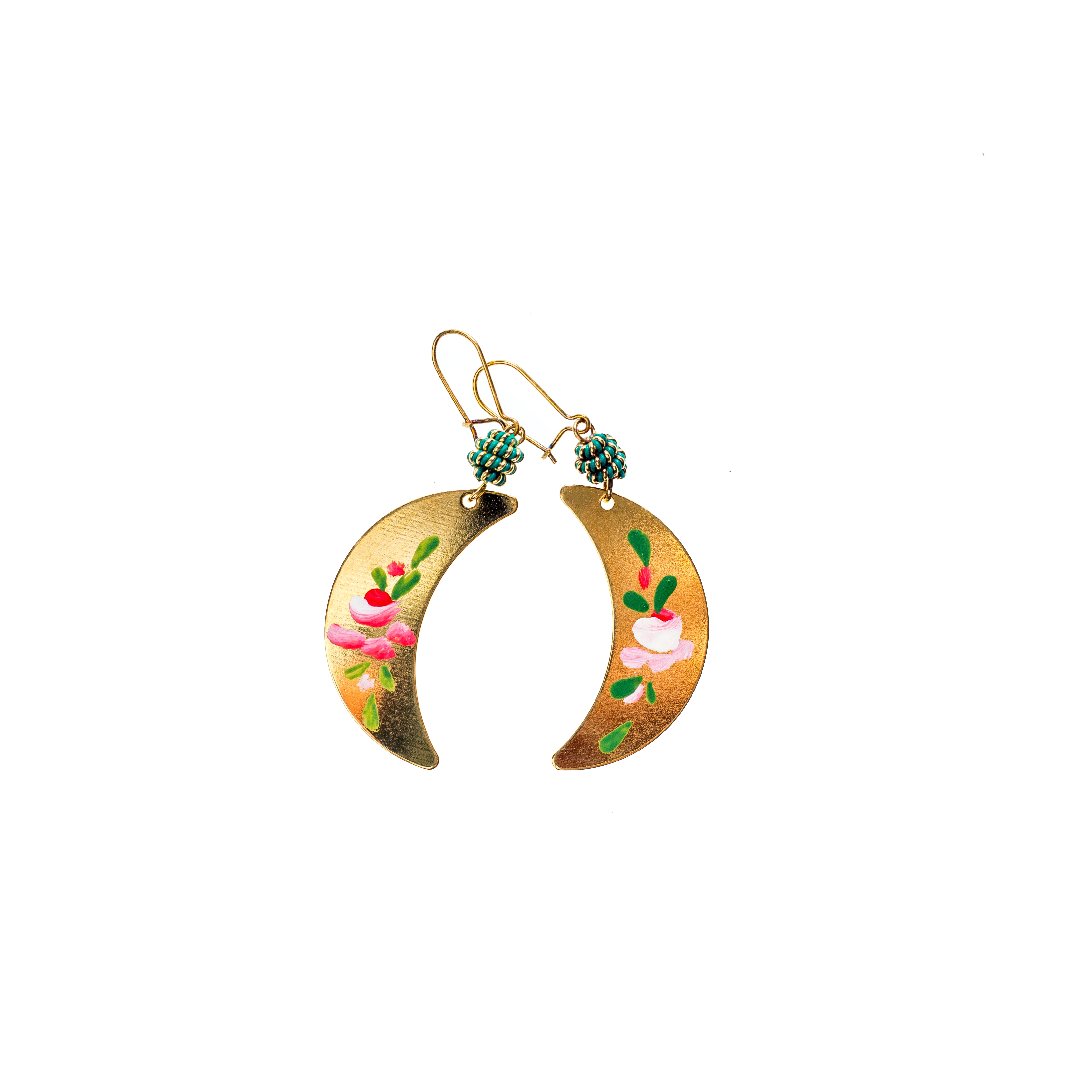 Χρυσά κρεμαστά σκουλαρίκια φεγγάρια με ζωγραφισμένα ροζ λουλούδια