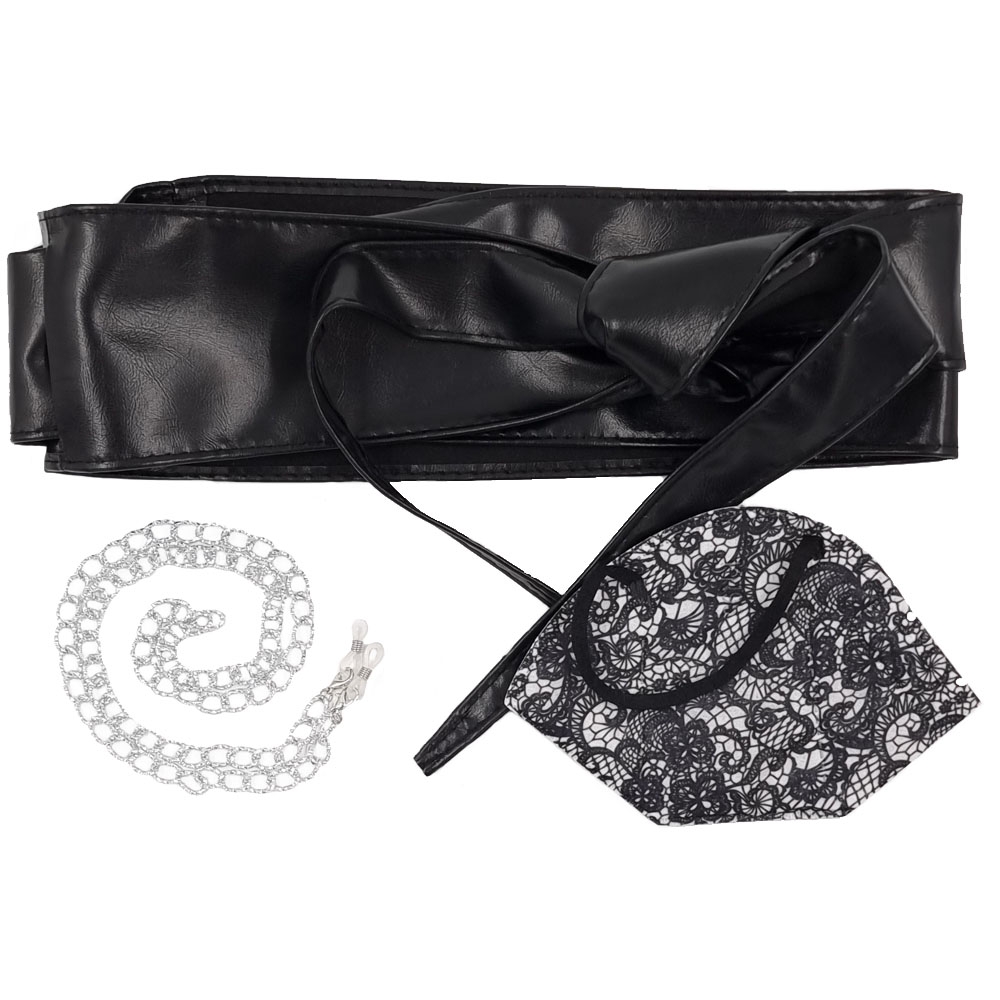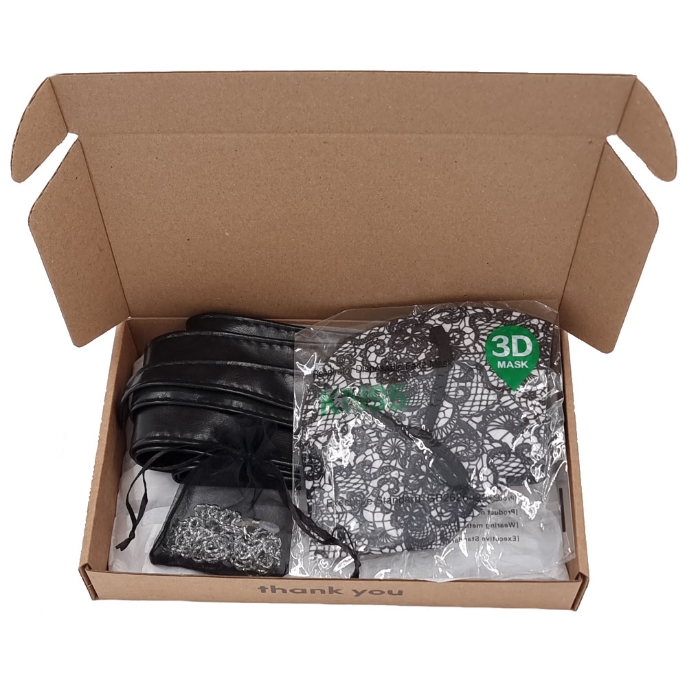 Gift box με γυναικεία μαύρη ζώνη one size, μάσκα KN95 lace print και ασημί σφυρήλατη αλυσίδα γυαλιών και μάσκας
