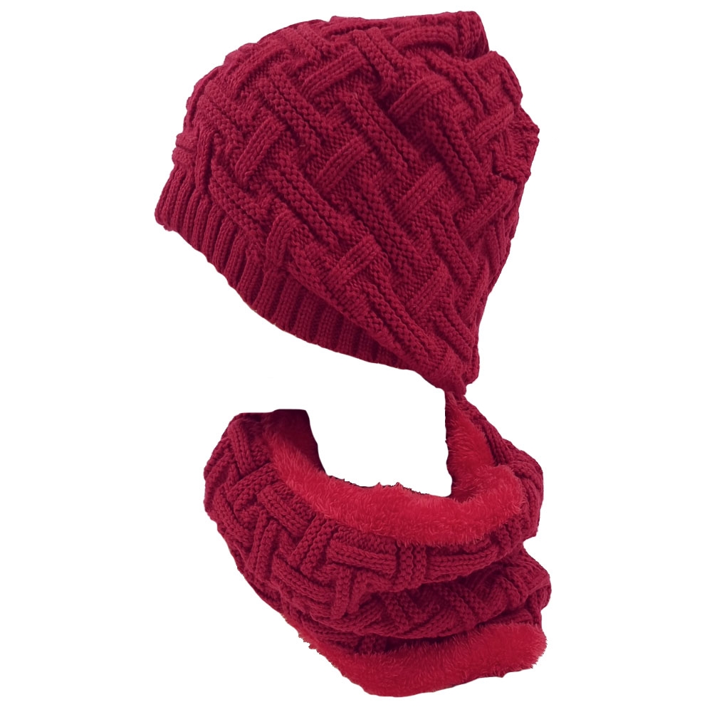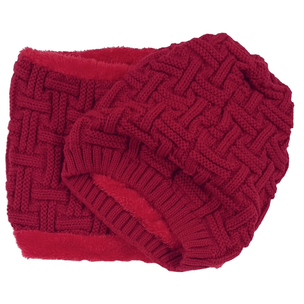 Wine μπορντό αφράτος πλεκτός σκούφος και λαιμός snood με μαλακή λούτρινη επένδυση