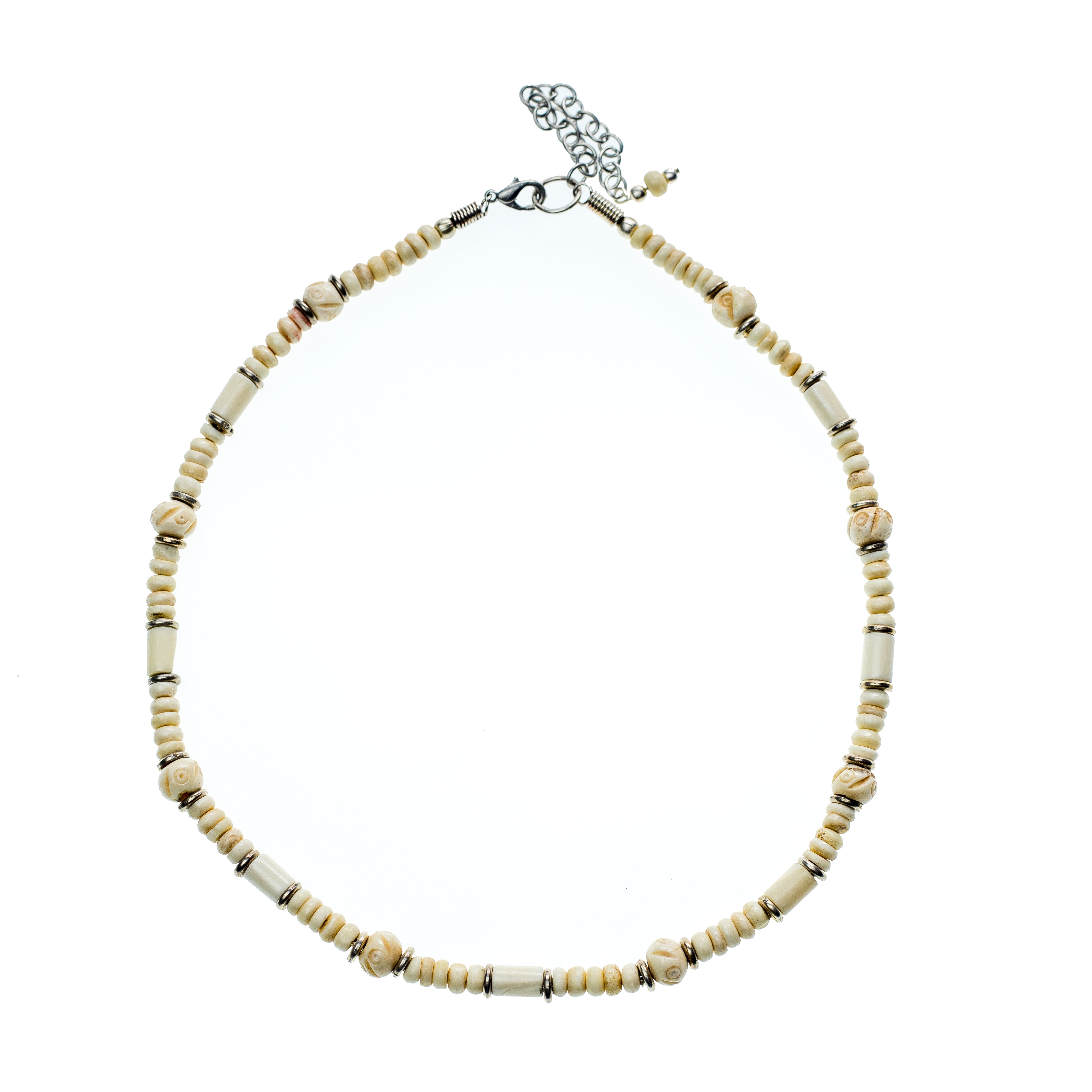 Κοντό κολιέ με μπεζ πέτρες και ασημί λεπτομέρειες