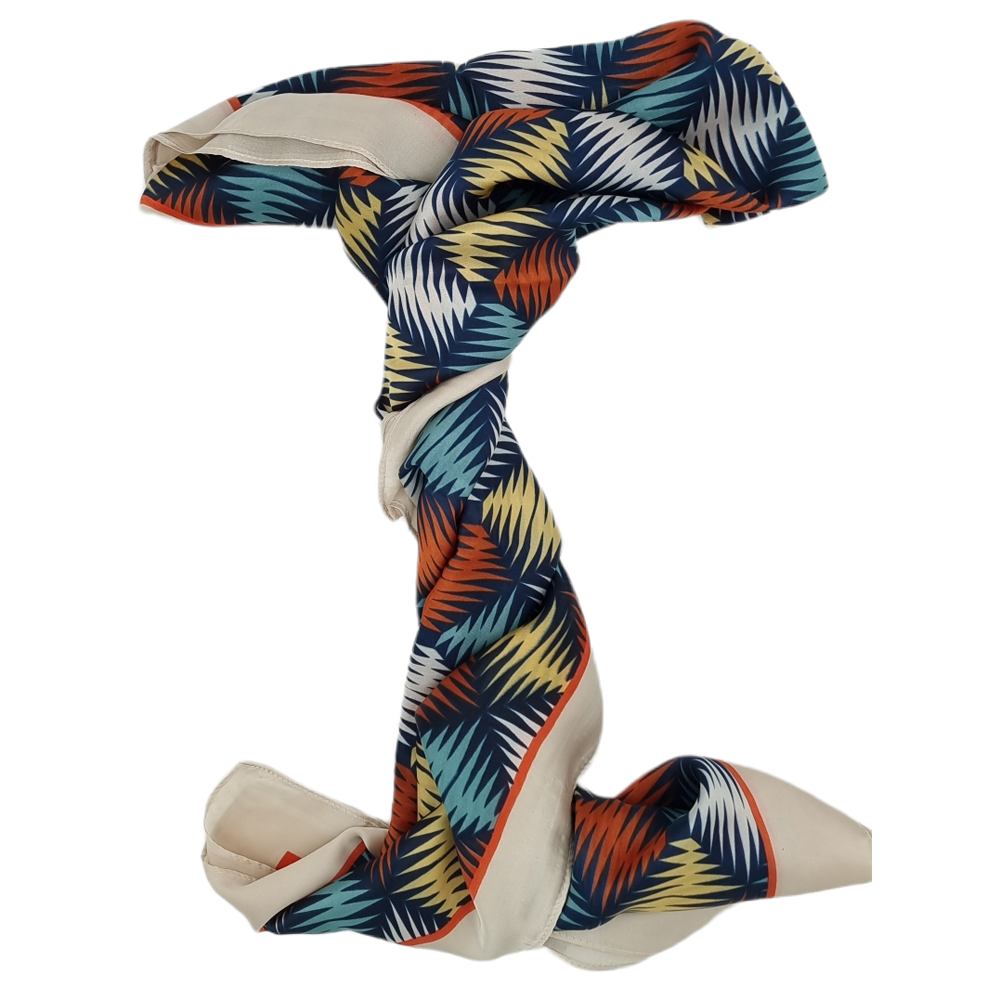 Φαρδύ μπλε φουλάρι με zig zag ρόμβους και εκρού μπορντούρα από σύμμεικτο μετάξι